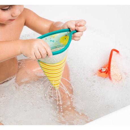 César, Alice et un martin-pecheur ont chacun embarqué sur leur voilier, prets à disputer une petite régate ! Oh ! Alice et César ont chaviré, leurs bateaux, tout inondés, sont devenus de véritables passoires ! Retourne-les et regarde l’eau s’écouler en jolis jets !