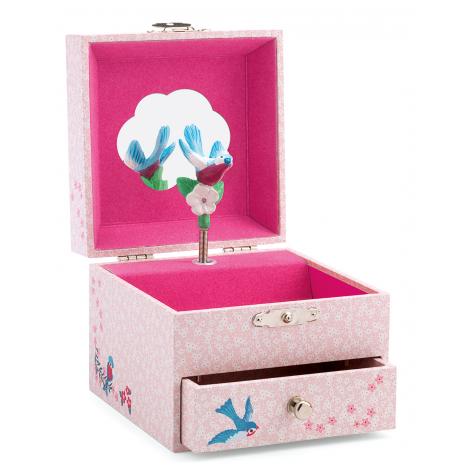 Une petite boite à musique Djeco avec tiroir où un oiseau pinson se mettra à danser lorsque vous actionnerez la musique. Le tiroir et le compartiment lui permettront de ranger bijoux, trésors et secrets... et de s'admirer dans le petit miroir devant lequel danse l'oiseau.